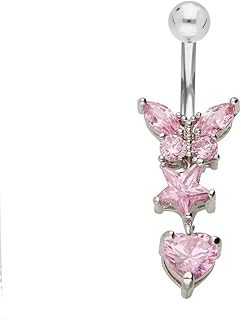 | Silberne Piercing Banane mit 3 ANHÄNGERN - 316L Chirurgenstahl - Bauchnabelpiercing Silber - Pinker Schmetterling, Stern und Herz - Curved Barbell mit Zirkonia - Kugel zum Schrauben
