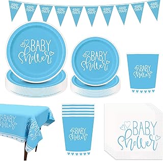 Amycute 88-teiliges Baby Shower Partygeschirr Set, Baby Shower Party Deko,Babydusche Dekorations - Banner,Teller Becher ,Servietten, Geschirr Kit für eine Junge Babyparty.