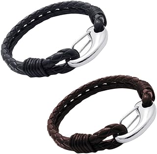 Herren Damen Armband, Geflochten Wickel Lederarmband Armreif Armschmuck Handgelenk mit Edelstahl Verschluss, Schwarz Braun