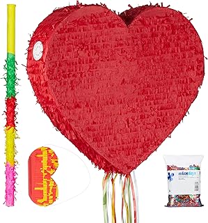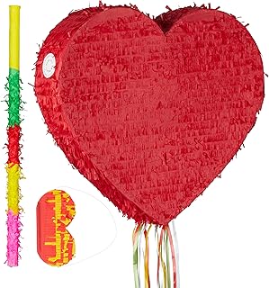 Relaxdays 4 TLG. Pinata Set Herz rot, XXL Konfetti Sack 0,28 kg, Pinatastab mit Augenbinde, Herzpinata, Pinatastock & Maske, bunt