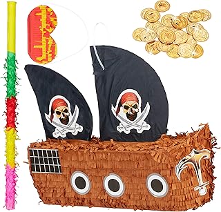 Relaxdays 291 TLG. Pinata Set Piratenschiff, Pinatastab & Augenbinde, 288 Goldtaler, Piraten Piñata, Stab mit Augenmaske, bunt