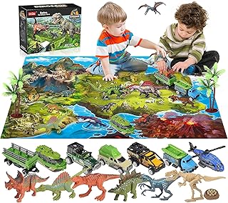 Oriate 32-teiliges Dinosaurier-Jagdfahrzeug-Spielset mit 6 Dinosaurierfiguren Pädagogische Dinosaurierwelt-Spielmatte, einschließlich Tyrannosaurus, Anhänger, Baum, LKW für Kinder, Jungen und Mädchen