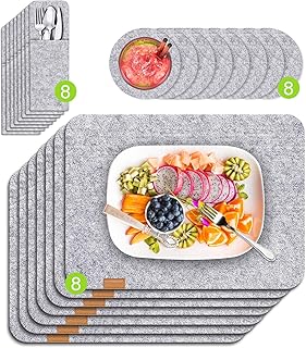 Kuchisity Tischset Filz Platzset, 24er Set Abwaschbar Tischsets, 8 Platzsets (44x32cm) | 8 Untersetzer | 8 Bestecktasche, Abwischbar Platzdeckchen Tischuntersetzer, Platzset für Zuhause (Grau)