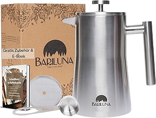 BARILUNA® French Press aus Edelstahl | 1 Liter (5 Tassen) Coffee Press | Doppelwandig isoliert | Kaffeebereiter inkl. Dosierlöffel, Ersatzfilter & E-Book | Kaffeepresse für Camping & Wohnmobil