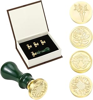 Lewondr Wachs Stempel Set, 4 x Abnehmbarer Wachssiegel Stempel Köpfe & 1 x Holzgriff, Siegelwachsstempelset für Einladungen Umschläge Grußkarten, Rose+Maiglöckchen+Kranz+Sonnenblume