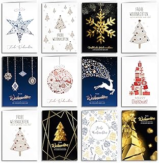 Weihnachtskarten mit Umschlägen - 24 Stück | 12 verschiedene Motive (veredelt) | Für jeden die passende Karte zu Weihnachten | Edel Weihnachtskarten-Set modern Klappkarten mit Umschlag Set Kraftpapier