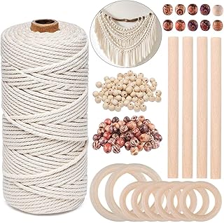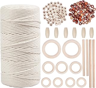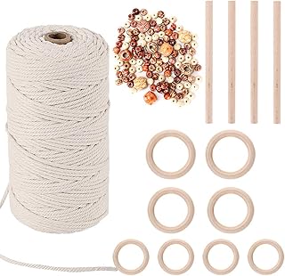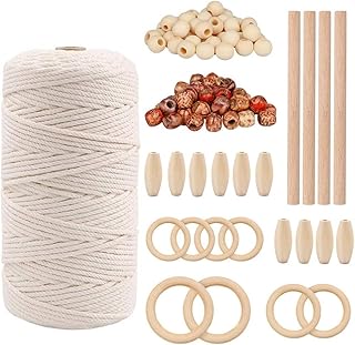 Makramee Baumwolle, Natürliche Baumwollkordel Garn 3mm x150m, 2 Pcs Holzstäbchen 8 Pcs Holzringe 120 Pcs Holzperlen für Wandbehang Hängepflanze, DIY Dekoration Weben, Basteln, dekorative Projekte
