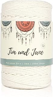Tim und Jane® Makramee Garn 3mm x 300m, gedreht | 100% Baumwollgarn, Nicht Gebleicht | Natur Weiß | Makramee-Garn ohne Kern | Macrame Cord für Wandbehang, Blumenampel
