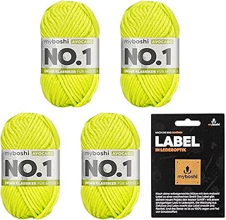 myboshi No.1-Wolle, inkl. original Label in Lederoptik, 4 Knäuel, zum Häkeln/Stricken, hochwertiges Schnellstrickgarn, langlebige Mützenwolle, Mulesing-frei